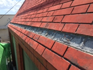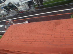- 道路斜線制限部分の屋根の状況です。おそらくラス網を設置して、モルタルを塗り、直接、タイルが貼ってあるので、年数が経過すると雨水が外壁を伝わって雨漏りしてる可能性があります。