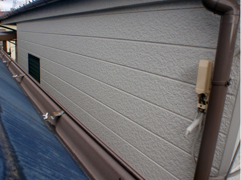 - 今回は練馬区東大泉のとても環境のよい閑静な住宅地です。駅から割と近いこともありまして、近隣には商店街も近く、少し行くと割とにぎやかなところがあります。閑静な住宅地と商業地の間ぐらいの街並みです。築20年以上で、屋根は一番上はFRPの防水で斜めの屋根はコロニアルです。外壁はボードサイディングです。メンテンスは10年以上前にやられているようです。ご注文を頂いたきっかけは、1年半前に近隣で雨樋の交換工事を行って、ちょうど施主様の雨樋が大雪で破損したのをおみかけしたので、お声をかけさせて頂きました。
